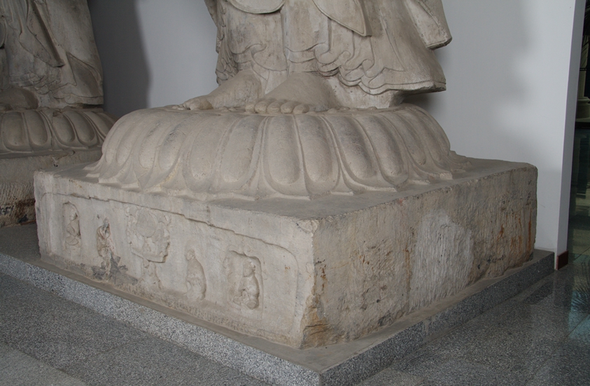 流传经历:这两尊石造像与另两尊北齐石菩萨造像原安放于山东临淄龙泉寺内,据《临淄县志》记载:“龙泉寺在龙池村西北淄水岸上,尚有石佛四,各高丈八尺”。“六朝石佛,在龙池村龙泉寺故址,佛高丈余,有荷兰人见之,谓形容与印度古石佛相同,真六朝物也,欲购之不可乃止。”1928年日军入侵山东时,日本商人曾两次预谋将佛像盗回日本,据1928年7月24日上海的《申报》报道说:“......临淄县龙池地方,有石佛两个(应是四个),成化碑一座,碎碑一方,在数年前曾有中国败类,拟将佛碑等以三万元之代价售予日本人,为地方人士闻知,出而干涉,故未成交,此次日本占据济南及胶济路沿线以迄青岛,龙池适在日本人所谓之二十里以内,某日人垂涎龙池之古佛碑等已久,乃于本月十五日,率人将佛碑一并劫取,运至淄河店车站,预备运往日本……。”而后,当时正逢发生济南“五三”惨案之后,中国人民的反抗斗争风起云涌,日本侵略者迫于形势,未敢将这批文物盗走,只将两尊小石像的头盗走。1930年由原青岛市铁路局局长、青岛四方机厂原厂长栾宝德派专车将其运至青岛,安放于当时的四方公园内,以后由于四方机厂厂址不断扩大,就把这批文物圈进厂里了。据栾先生回忆,这批珍贵文物是在1928年日本人入侵山东、济南五三惨案发生之后发现的,当时,这批用草绳缠裹的石佛和石碑因无人管理,一直躺卧在淄河店车站任由风吹雨蚀,1930年,栾先生亲自调拨专列将这批石造像和石碑从淄河店车站运至青岛。