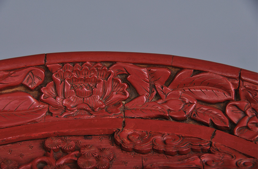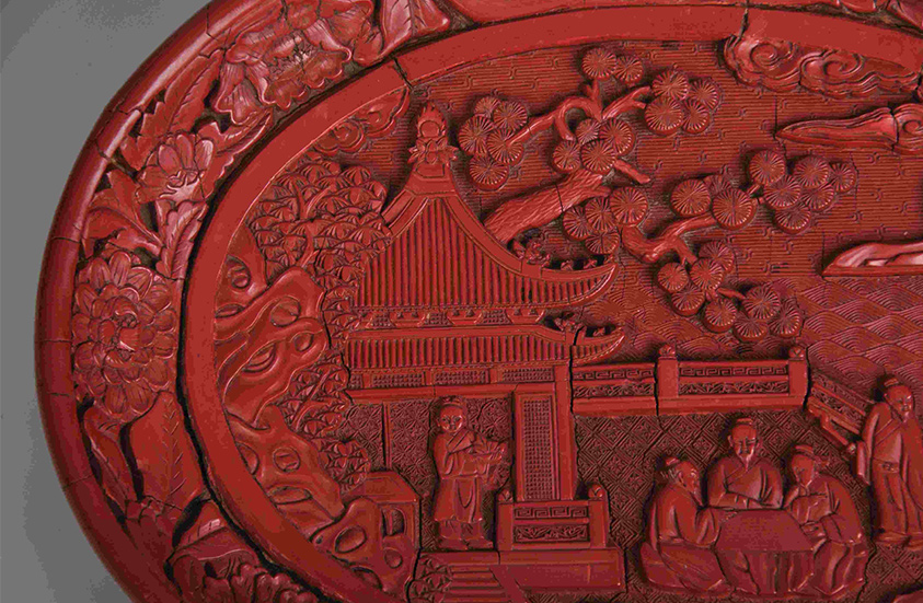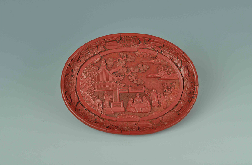 此文物呈椭圆形,弧壁,平底,圈足。漆色润红艳丽,雕刻极为细致圆润。盘中央雕刻有生动的人物图案:在小亭栏杆中央,三位老者专注地下棋,身后有回首张望的执杖老者,随有携古琴的童子,小亭内有捧茶欲出的童子。画面用三种锦地表示不同的空间,八瓣花卉纹表示大地,波纹表示湖水,云纹表示天空。点缀的花草树木与行云流水相互呼应,衬托出庭院屋舍的清幽。盘外壁雕刻有大朵的牡丹花和芍药花,花朵饱满圆润,花叶肥硕繁茂,枝叶舒卷自如。