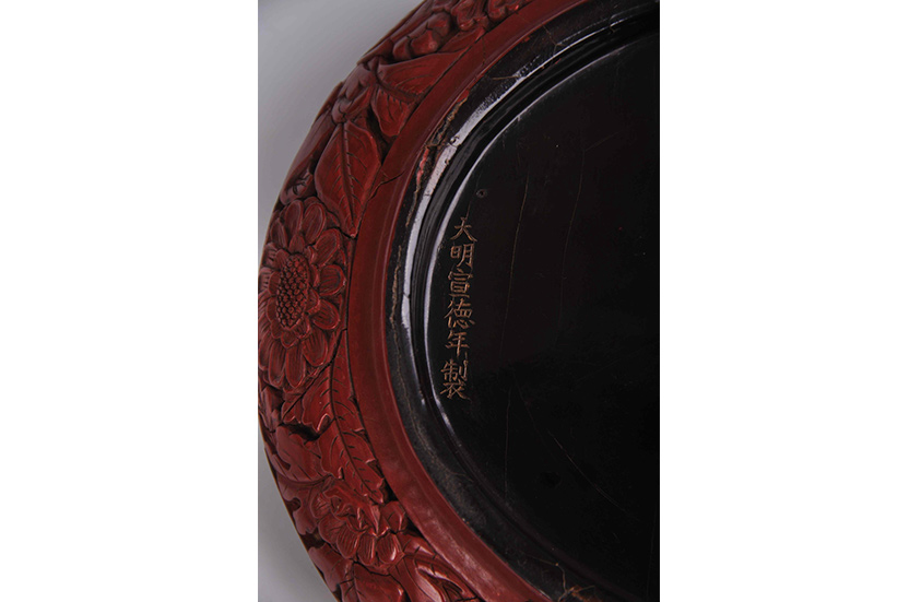 此为一件双款的漆器。漆盘底部髹黑漆,上面刀刻填金“大明宣德年制”楷书款,此款下面隐藏着“大明永乐年制”的刻款。相似漆盘较为罕见,弥足珍贵。