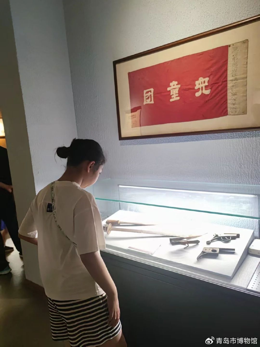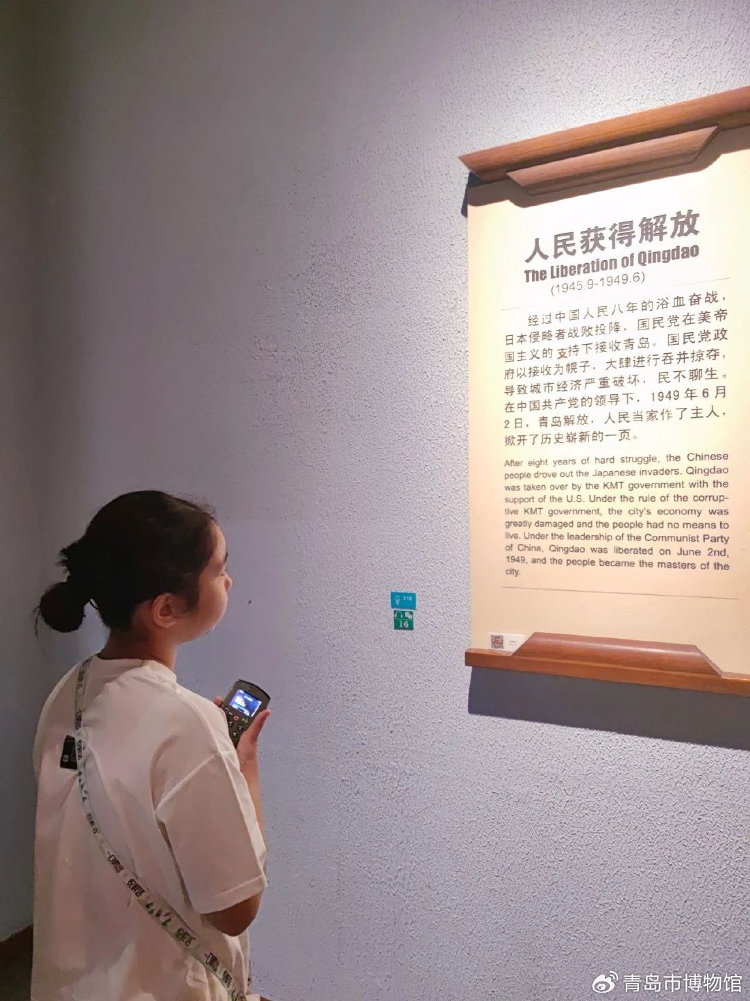暑假,我和爸爸妈妈来到青岛市博物馆参观,这张照片是妈妈给我拍的,我在用语音导览设备听取着这段历史。位置是在《青岛史话》第二部分“岁月回眸”。“讲述了青岛城市从清朝末年正式建置,历经德日强占,北洋军阀和国民党第一次统治,八年抗战,迎接解放的历史”。