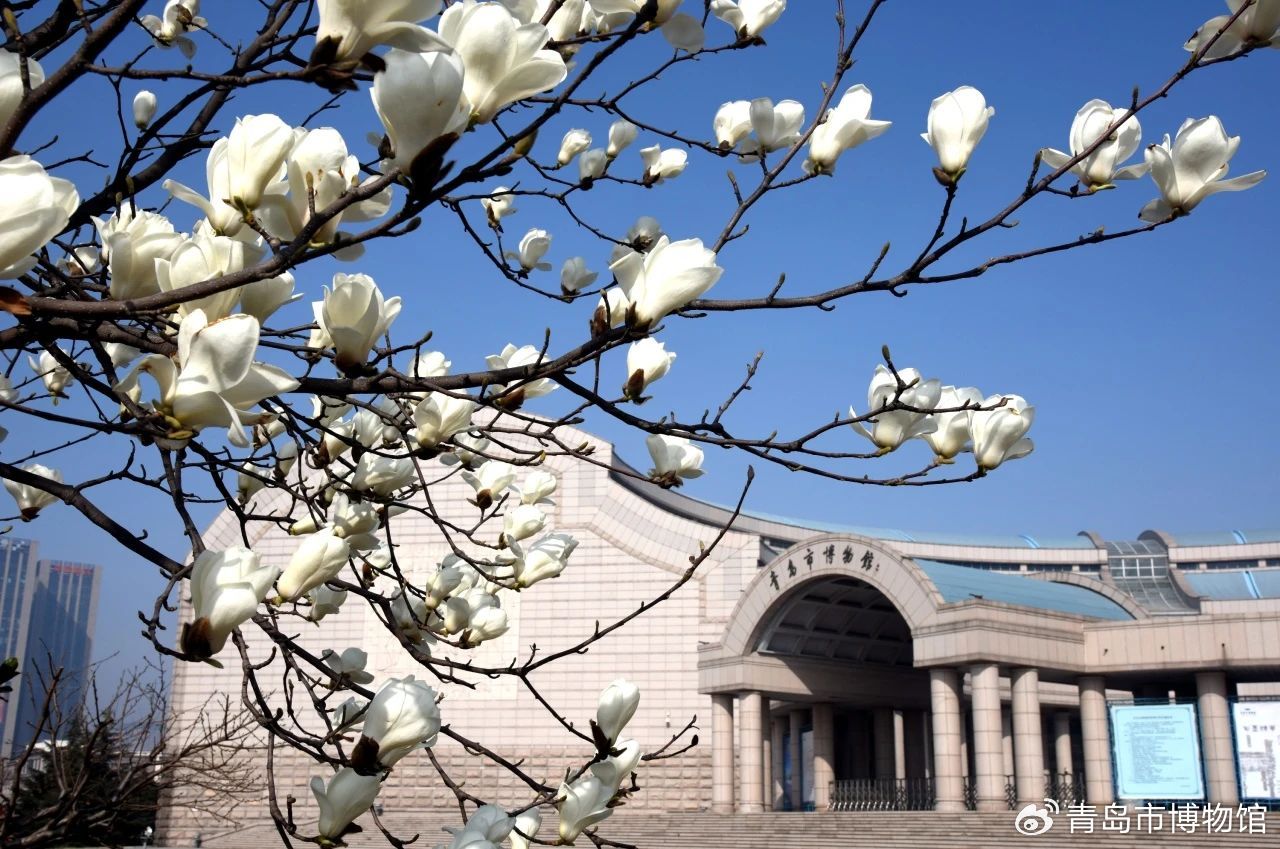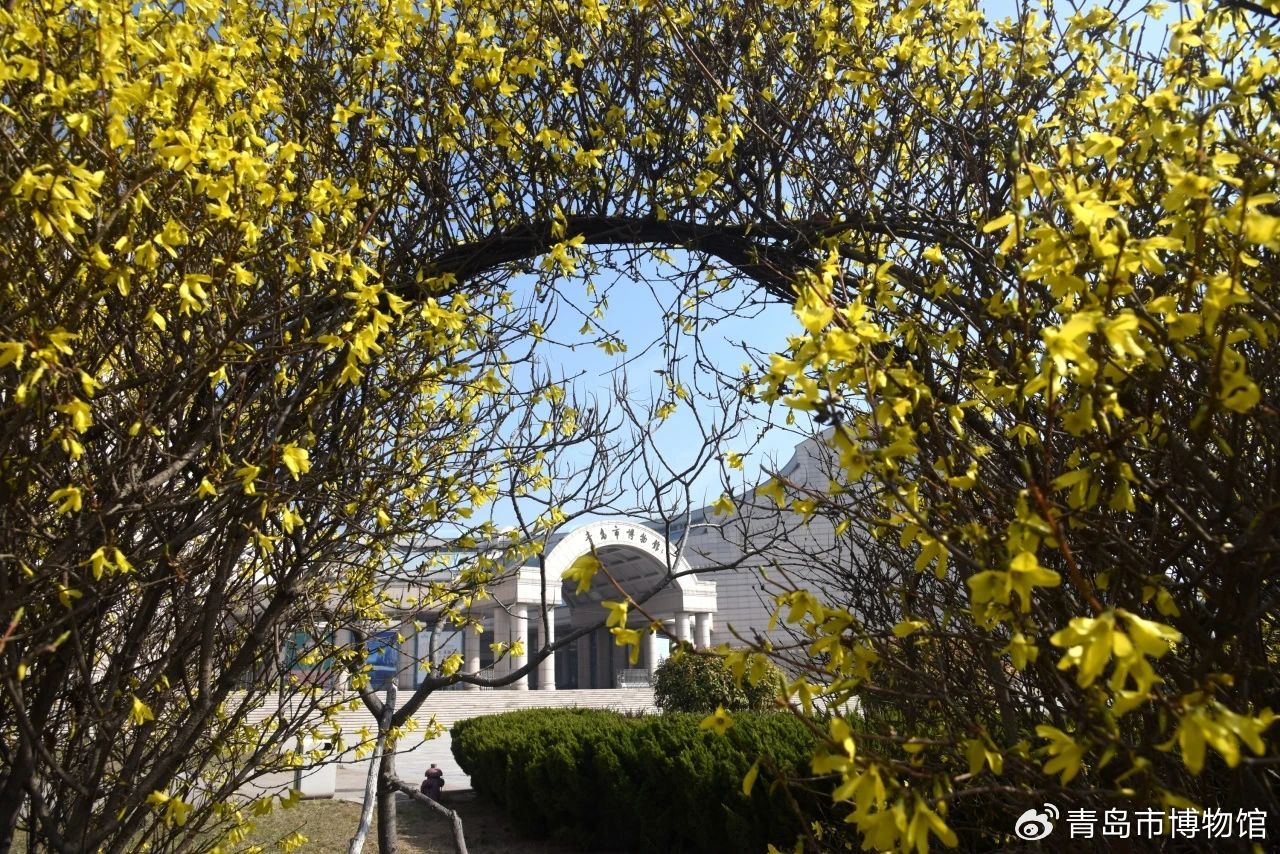 暮春玉兰堆雪、春日连翘垂金,与青岛市博物馆的春日相逢,建筑在花木间更显温润。
