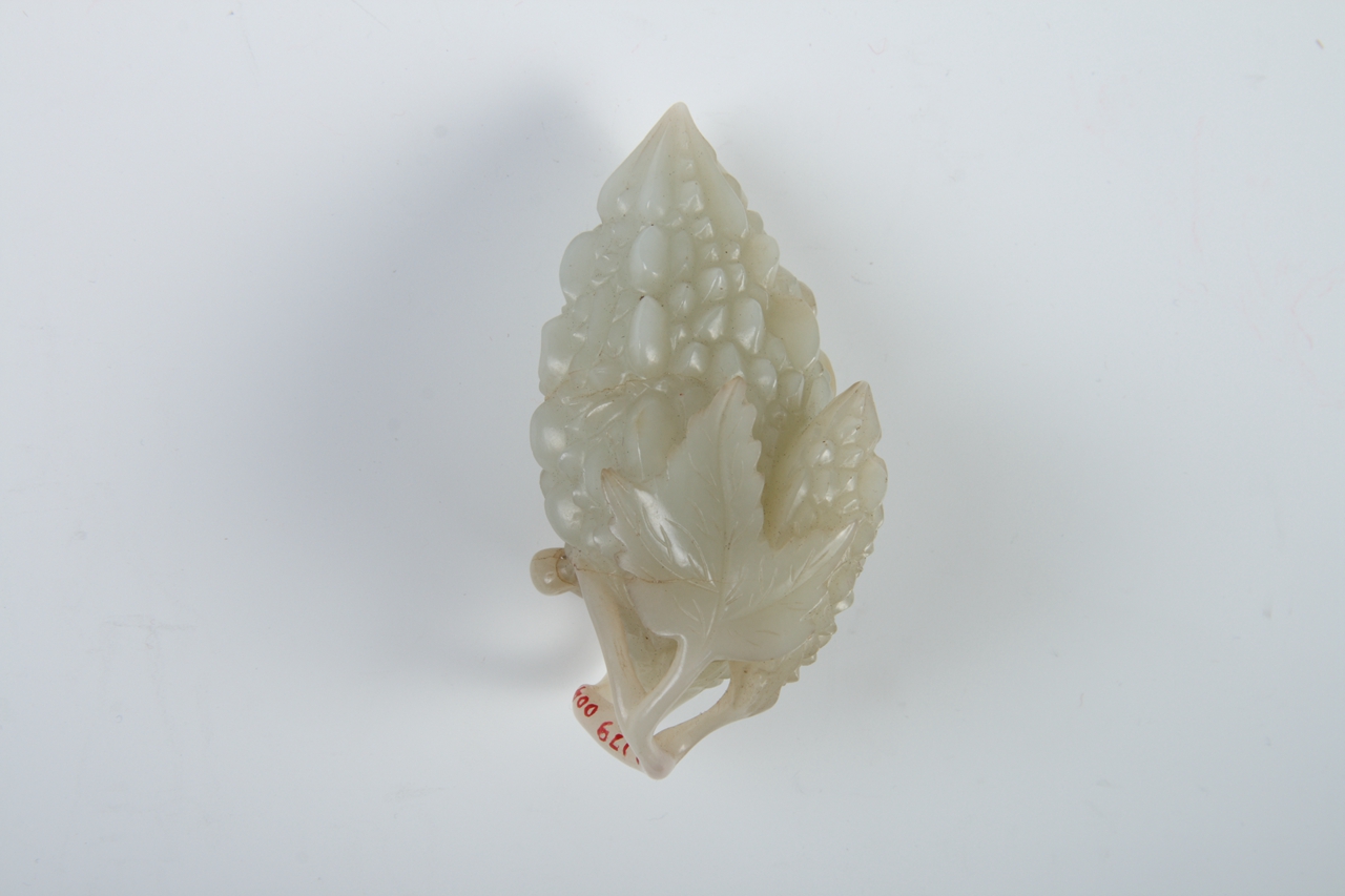 采用透雕和浮雕技法雕琢两个相连的癞瓜,果型圆润。癞瓜表皮大小不均的颗粒、自然缠绕的瓜藤等均细致刻画,蒂处透雕枝蔓。表面略有沁色似果实初熟之状,逼真自然。癞瓜因籽多而饱满,被认为有多子多福的美好寓意。