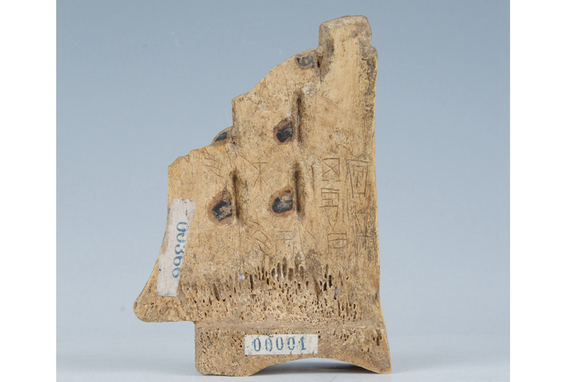 1950年入藏。不规则三角形。淡黄色,表面光润。甲骨的正反两面刻字,意是卜人卜问妇好是否怀孕,武丁占卜的兆相是妇好已经怀孕,吉。此件甲骨保存基本完整,甲骨文字清晰可见,是补证商代历史极为珍贵的实物资料。